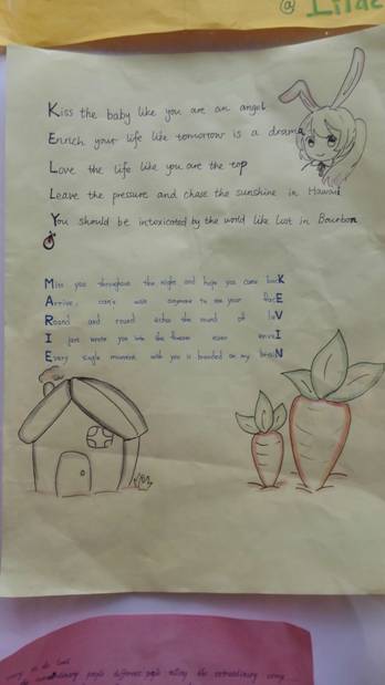 由于寒假后涉及到文理科分班,同学们将去往不同的班级,遇到新的老师。为了便于师生们尽快互相认识和了解,高一英语老师们给同学们布置了创作一首英文名藏头诗的作业。