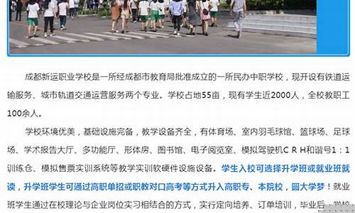 四川省成都市新运职业学校凭借其优质的教育资源、先进的教学设施、紧密对接市场需求的课程设置,已成为许多学生求学和提升技能的理想选择。无论是专业课程、实践教学,还是就业服务,学校都为学生提供了全面而高质量的支持。如果你也想通过技能培训提升自身竞争力,那么四川省成都市新运职业学校无疑是一个值得选择的优质平台。